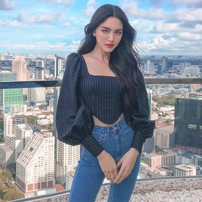 MaiDavika同款黑色条纹衬衫复古大方领蓬蓬灯笼袖设计感短上衣潮热门设计联盟服务商